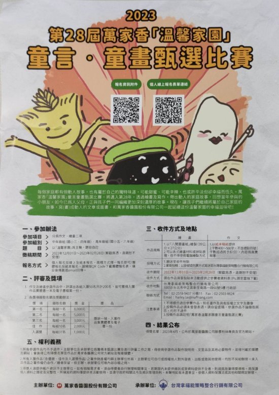 轉知 萬家香溫馨家園童言童畫甄選比賽,請自行報名送件。以「溫馨家園」為主軸,題目自訂。2022.12.1.-2023.2.28.止件。詳見附件檔。