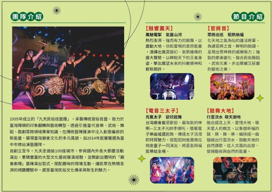 「九天民俗技藝團」成立於1995年,一心承襲傳統習俗技藝,並引進當代音樂、武術、舞蹈、戲劇等跨領域專業知識,致力於臺灣陣頭的印象翻轉及藝術轉型,讓陣頭表演走進文化之美,傳遞臺灣精神。本場節目《新屋天后宮-廟會狂響》演出内容包含「鼓響震天」、「官將首」、「電音三太子」、「鼓舞大地」等,在傳統陣頭匯演中注入創意編排的新能量,展現台灣廟會文化的多元風貌,此外也於節目間穿插趣味的現場互動,用熱情活力傳遞民俗文化知識,讓民眾在熱鬧澎湃的視聽體驗中,感受傳統文化傳承與新生的魅力!