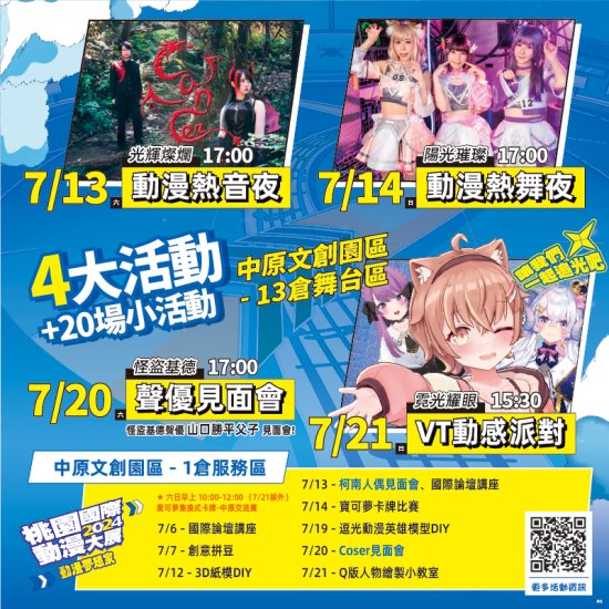 一、「2024桃園國際動漫大展」訂於本(113)年7月6日至21日假中原文創園區辦理,今年主題為「動漫夢想家--讓我們一起追光吧!」,期透過精彩作品帶大家看見超越國界、跨越文化追求夢想的精神,沉浸在動漫迷人的光彩中,對生活保有做夢、追夢的能量,找到屬於自己的亮光。