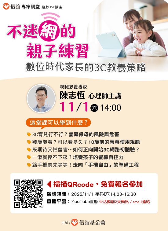 | 一、 | 面對數位裝置普及、AI浪潮來襲,教養挑戰正不斷升級。唯有從「家」出發,啟動正向3C教養策略,才能讓數位工具成為孩子成長的助力,而非阻力。信誼將於2025年11月1日(六)下午2:00-4:30舉辦【不迷「網」的親子練習:數位時代家長的3C教養策略】線上LIVE 講座,邀請家長免費報名參加。 |